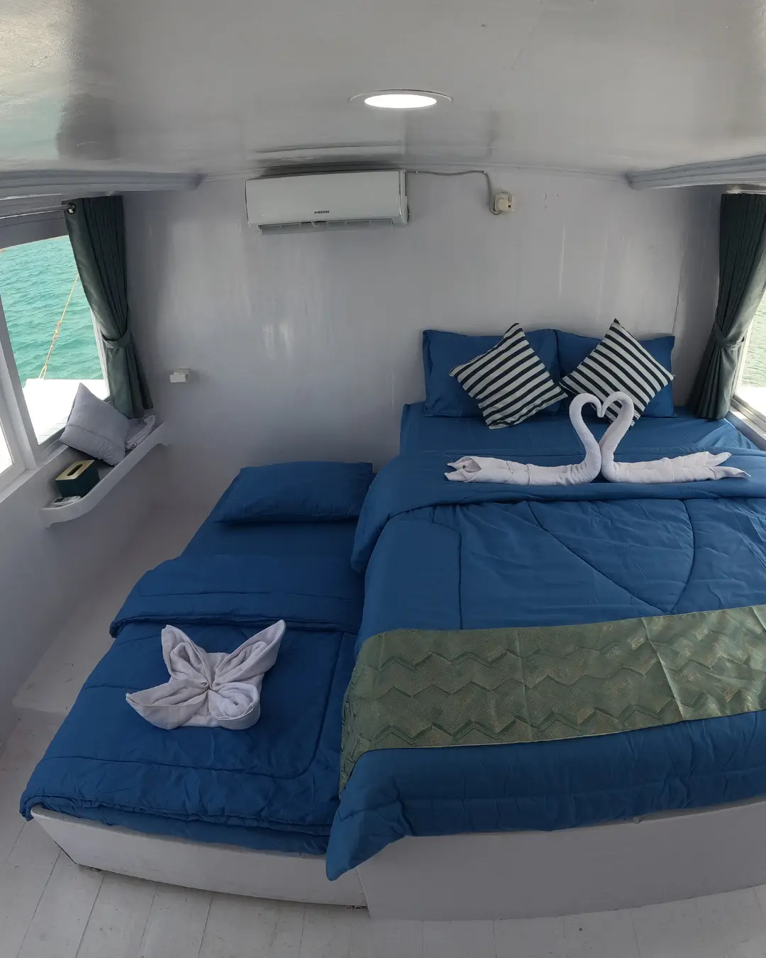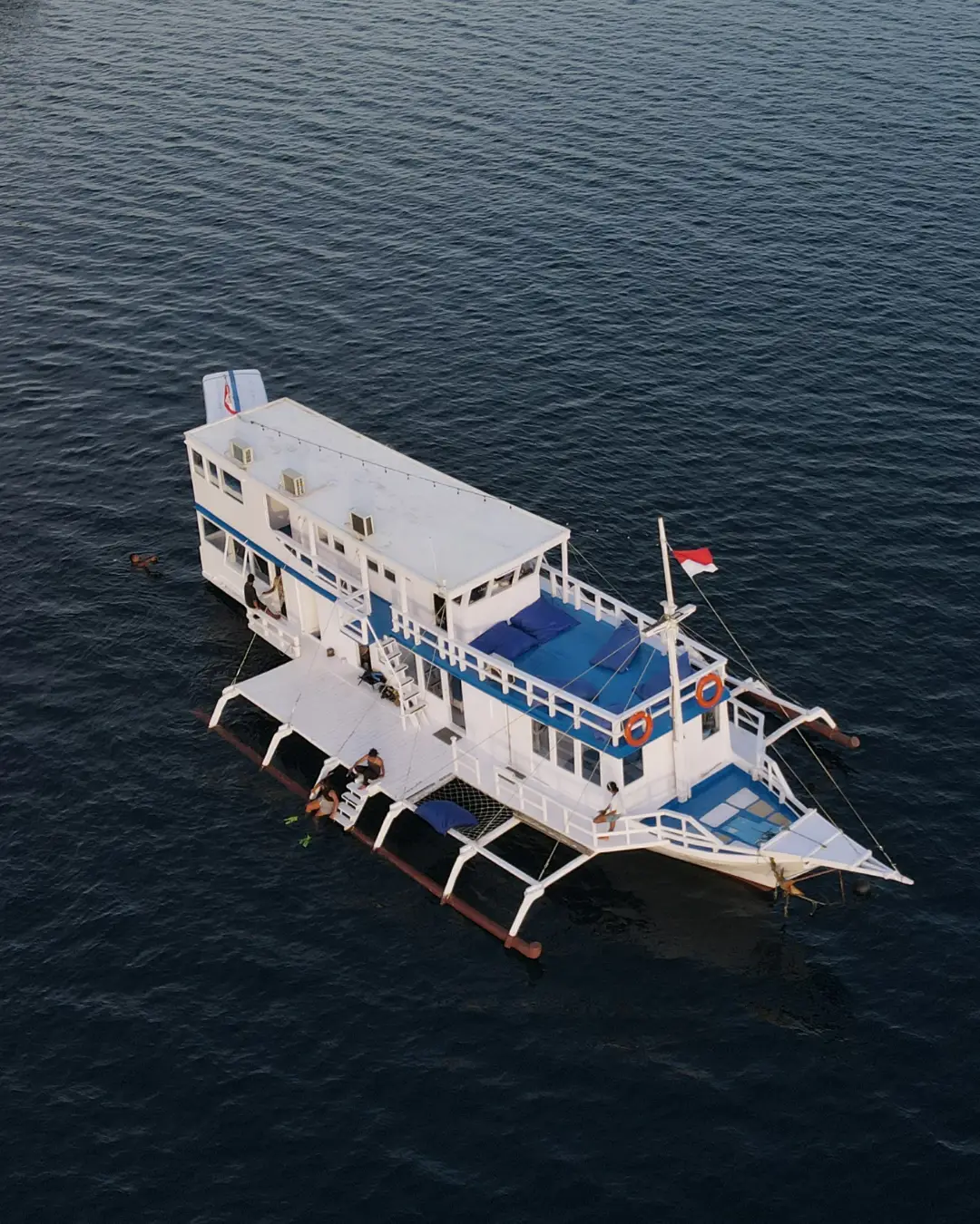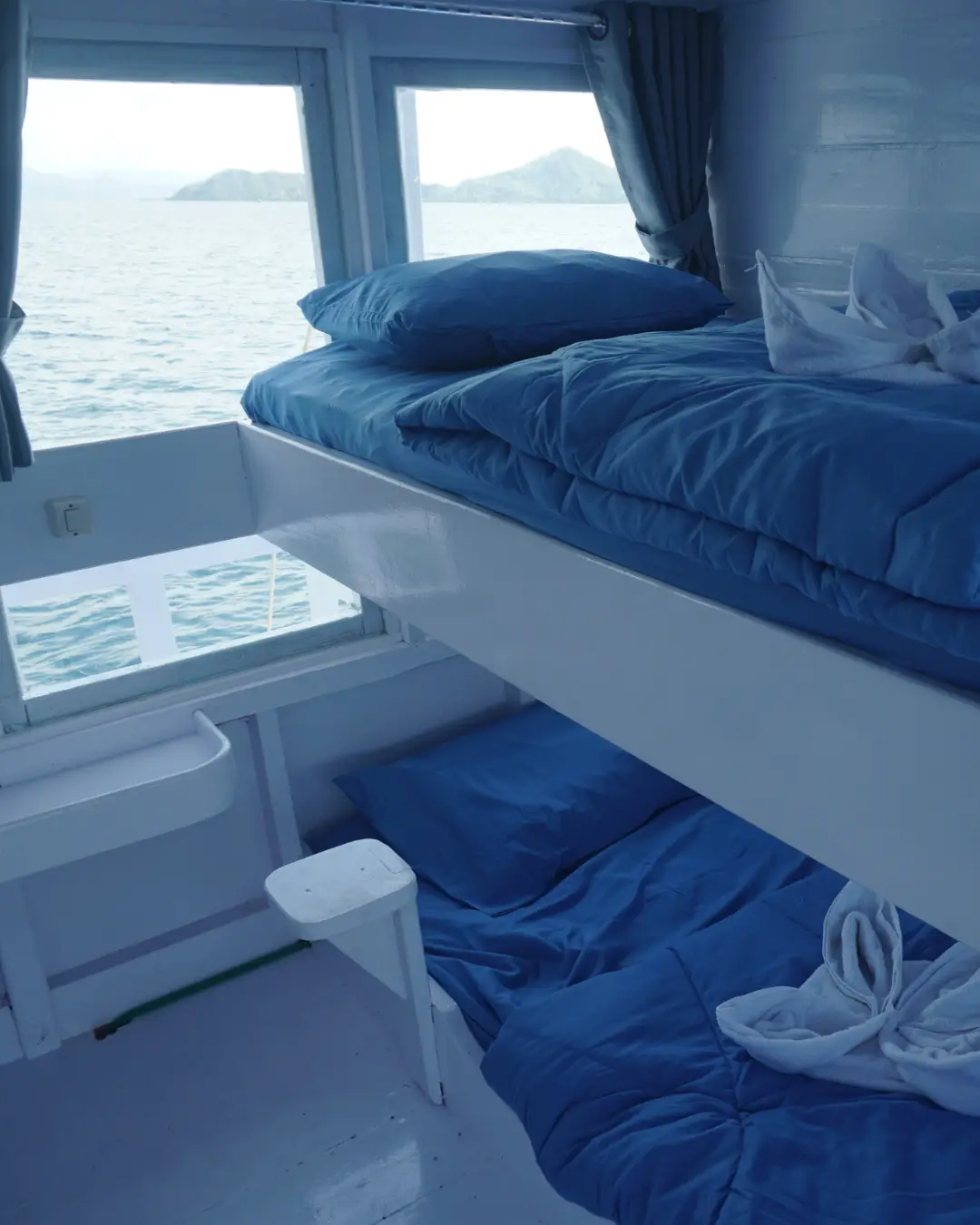 Open Trip Sailing Komodo 3D2N (Liveaboard). Highlight: cabin ber-AC, full board meals, snack + minuman, snorkeling gear + life jacket, transfer in/out, guide + dokumentasi. Catatan: jadwal/destinasi bisa berubah. Extra highlight: sundeck dengan bean bags, deck nets untuk relaxing, dan snorkeling gear.