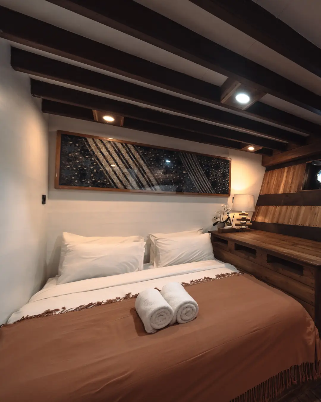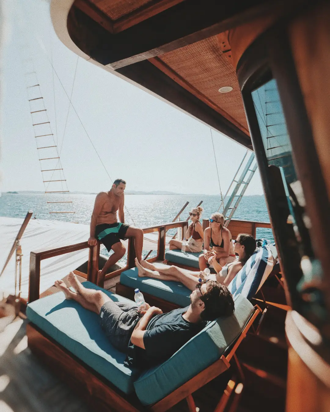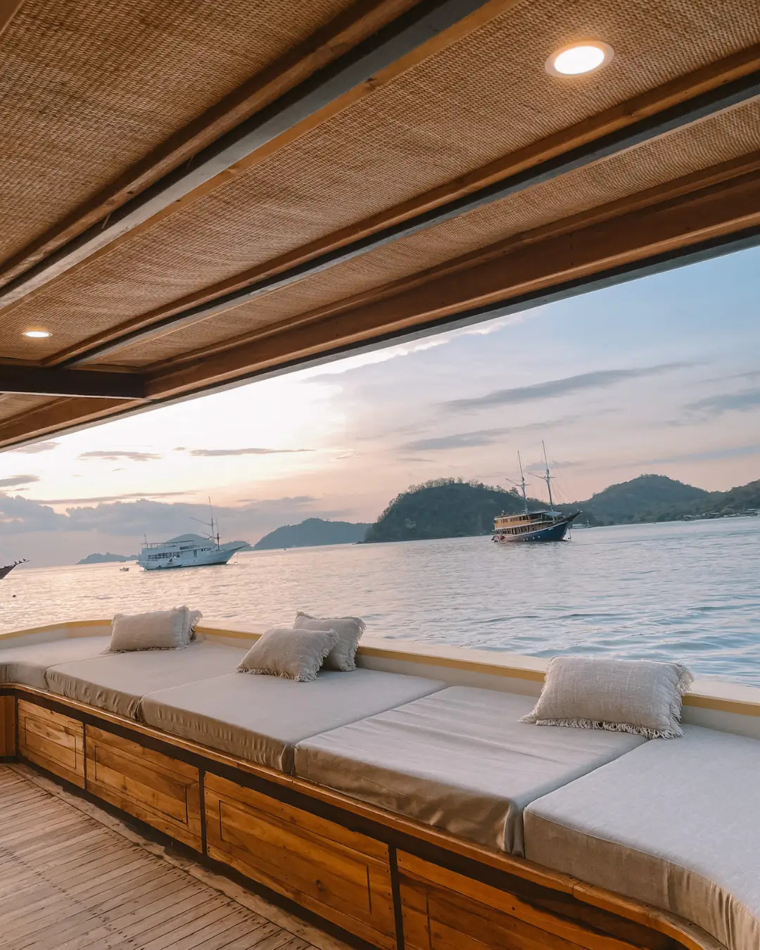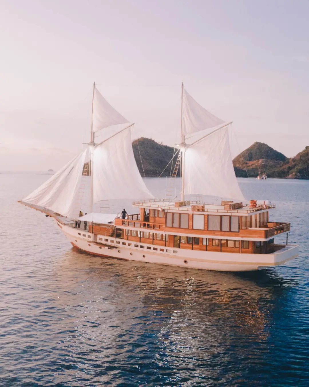 Open Trip Sailing Komodo 3D2N (Liveaboard). Highlight: cabin ber-AC, full board meals, snack + minuman, snorkeling gear + life jacket, transfer in/out, guide + dokumentasi. Catatan: jadwal/destinasi bisa berubah. Extra highlight: suasana boutique untuk group kecil, banyak lounge area, sky deck, Wi-Fi, paddleboard & canoe.