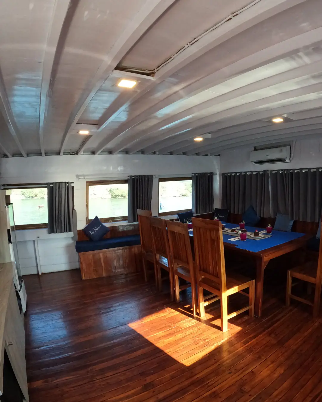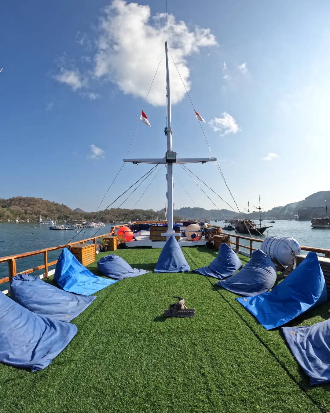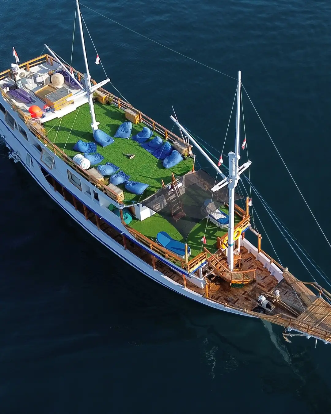 Open Trip Sailing Komodo 3D2N (Liveaboard). Highlight: cabin ber-AC, full board meals, snack + minuman, snorkeling gear + life jacket, transfer in/out, guide + dokumentasi. Catatan: jadwal/destinasi bisa berubah. Extra highlight: indoor AC dining, sundeck & lazy chair, Wi-Fi, canoes & snorkeling equipments.